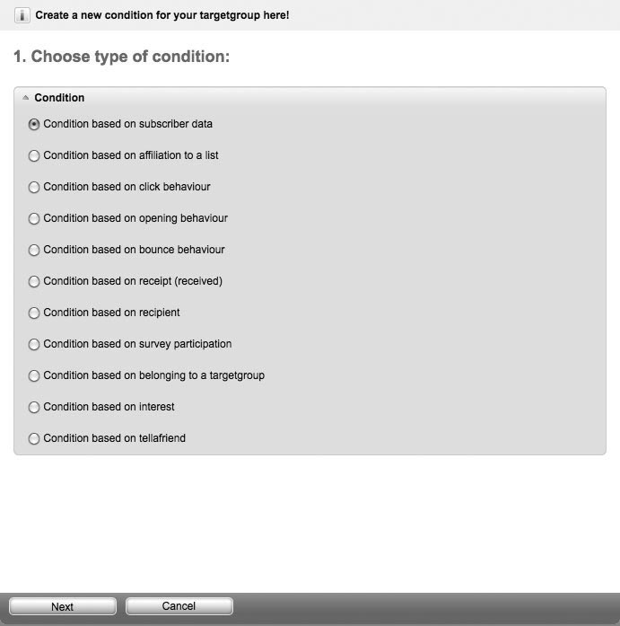 - 'Condition based on subscriber data' may let you separate the subscribers in title (and therefore sex) or affiliation to a company, interests and other information. The possibilities of choice result from the available subscriber fields (for information see 2.3. Subscriber Fields)