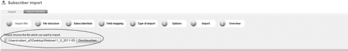 Save the file as a file with the feature 'CSV (Comma delimited)'. Apple user: If you own an apple computer, you will have to safe the file as 'CSV-Windows'. BetterNews does not run files in the Mac format. Step 1 – Import fileOn the navigation bar click on 'Subscribers' and then go to the navigation subitem 'Import'. This is the way how you get to the menu-guided import function of BetterNews. First, you will have to choose the file which you want to import; |