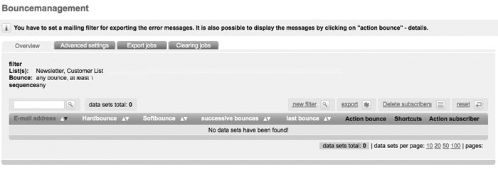In order to export, delete or reset bounces according to certain preferences, choose this function. Via an 'Export' you download a list of the detected bounces. 'Delete Subscribers' completely deletes the data records of those email addresses with which bounces have occurred. The action 'Reset' resets the amount of bounces to a certain date.