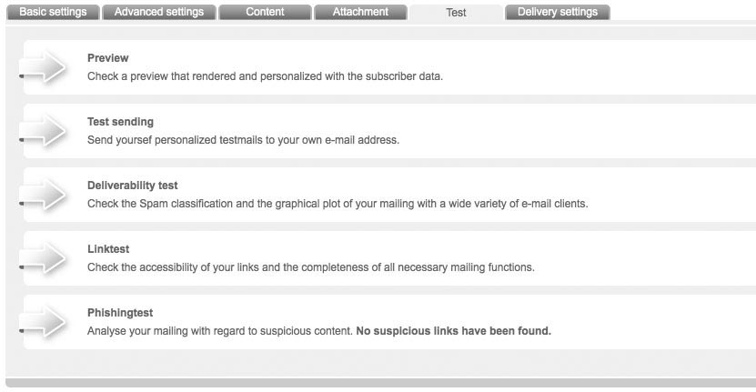 Having finished your newsletter, BetterNews offers you numerous testing possibilities. This helps you to optimize your mailing and achieve maximum success before actual dispatch. You can get to the testing functions by choosing the tab 'Test' in the menu in which you edit your mailing. Following tests are available: |
