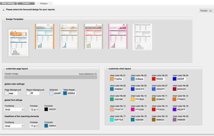 Now you also can adjust the design of your report. Choose the tab 'designs'. By default BetterNews suggests you six different layouts. HTML experts can also open the 'advanced settings' below the layouts to edit the html-code. For example you can insert your logo in th header.