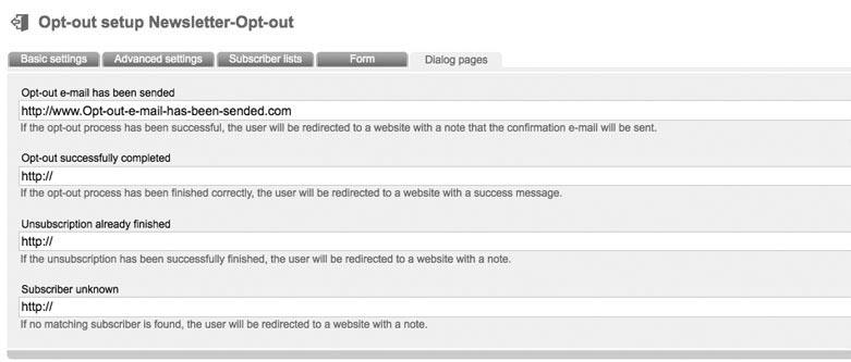 Enter a name and an optional description. Choose the 'mode' (important). The following modes are supported by 'BetterNews': Double-optout with confirmation e-mail: after unsubscribe from your website or your newsletter a confirmation email will be send automatically. Optout will be activated after clicking the confirmation link in this email. After successful unsubscription the former subscriber will get a last email („You unsubscribed successfully of our newsletter.“) Double Optout: Like described before, but without sending of a „successful unsubscription“ e-mail Confirmed Opt-Out (recommended): After unsubsubscription on your website or in your newsletter a „successful unsubscription“ email will be sended immediately. Single Optout: No e-mails will be send. There just will be a message in your browser, that optout was successfull. In Tab 'advanced settings' you can deposit your e-mail address in field 'e-mail forwarding', to be informed about unsubscriptions. Tab 'subscriberlists': Choose your favorite subscriberlist(s), where all unsubscriptions should be logged out. Select the subscriberfields, which should be filled out by your subscribers in tab 'Form'. After clicking 'create form fields' a popup appears, where you can choose and add subscriber fields to your form. Click 'sort formular fields' to arrange your fields. Click 'test form' to open a new tab in your browser with a preview of your form. Source Code of your website is genereated by 'BetterNews' by clicking 'Formular soruce code'. A popup appears with your source code. Last tab: Dialog pages |