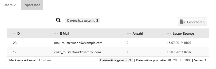 Reiter 'Überblick'Hier werden alle E-Mail-Adressen aufgelistet, deren Versendungen aufgrund von drei aufeinanderfolgenden Hardbounces zurückgehalten werden. Diese Adressen werden auf der BetterNews-internen 'Retained List' gesammelt. Verwaltet werden hier ausschließlich die reinen E-Mail-Adressen, unabhängig von den dazugehörenden (eventuell ehemaligen) Abonnenten. Oben rechts können Sie mit Klick auf den 'Exportieren'-Button die zurückgehaltenen E-Mail-Adressen als CSV-Datei exportieren. Die erzeugte CSV-Datei lässt sich anschließend auf dem Reiter 'Export-Jobs' herunterladen.