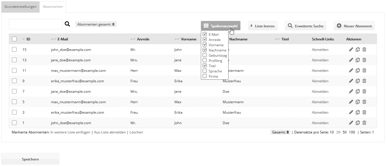 Abonnentendaten wie E-Mail-Adresse, Anrede, Vor- und Nachname werden in Abonnentenfeldern gespeichert. Sie können bei Bedarf weitere Abonnentenfelder anlegen, beispielsweise um Firma, Kundennummer oder das Geburtsdatum zu speichern. Über das Suchfeld oder die erweiterte Suche lässt sich gezielt nach Einträgen in der ausgewählten 'Abonnentenliste' suchen. Derselbe Abonnent in mehreren Listen?Ja, ein Abonnent kann mit seiner Abonnenten-ID zu mehreren Listen gehören, erkennbar in der Abonnentenverwaltung. Per Dublettenabgleich können (und sollten) Sie jederzeit Abonnenten mit identischen Daten unter einer Abonnenten-IDs zusammenführen. Das ist auch für Dubletten in verschiedenen Listen möglich, denn die Listenzugehörigkeit bleibt erhalten. Abonnentenliste löschenWird eine Abonnentenliste gelöscht, geht den darin enthaltenen Abonnenten zwangsläufig auch diese Listenzugehörigkeit verloren. Sollten Abonnenten danach zu keiner weiteren Liste gehören, werden sie gelöscht. Ansonsten verbleiben sie in ihren noch existierenden Listen. Abonnenten suchenBei der Abonnentenübersicht können Sie die erweiterte Suche nutzen, um bestimmte Abonnentengruppen herauszufiltern. Nach Auswahl einer Zielgruppe oder Eingabe einzelner Suchbegriffe, werden Ihnen alle zu Ihrer Suche passenden Abonnenten angezeigt. |